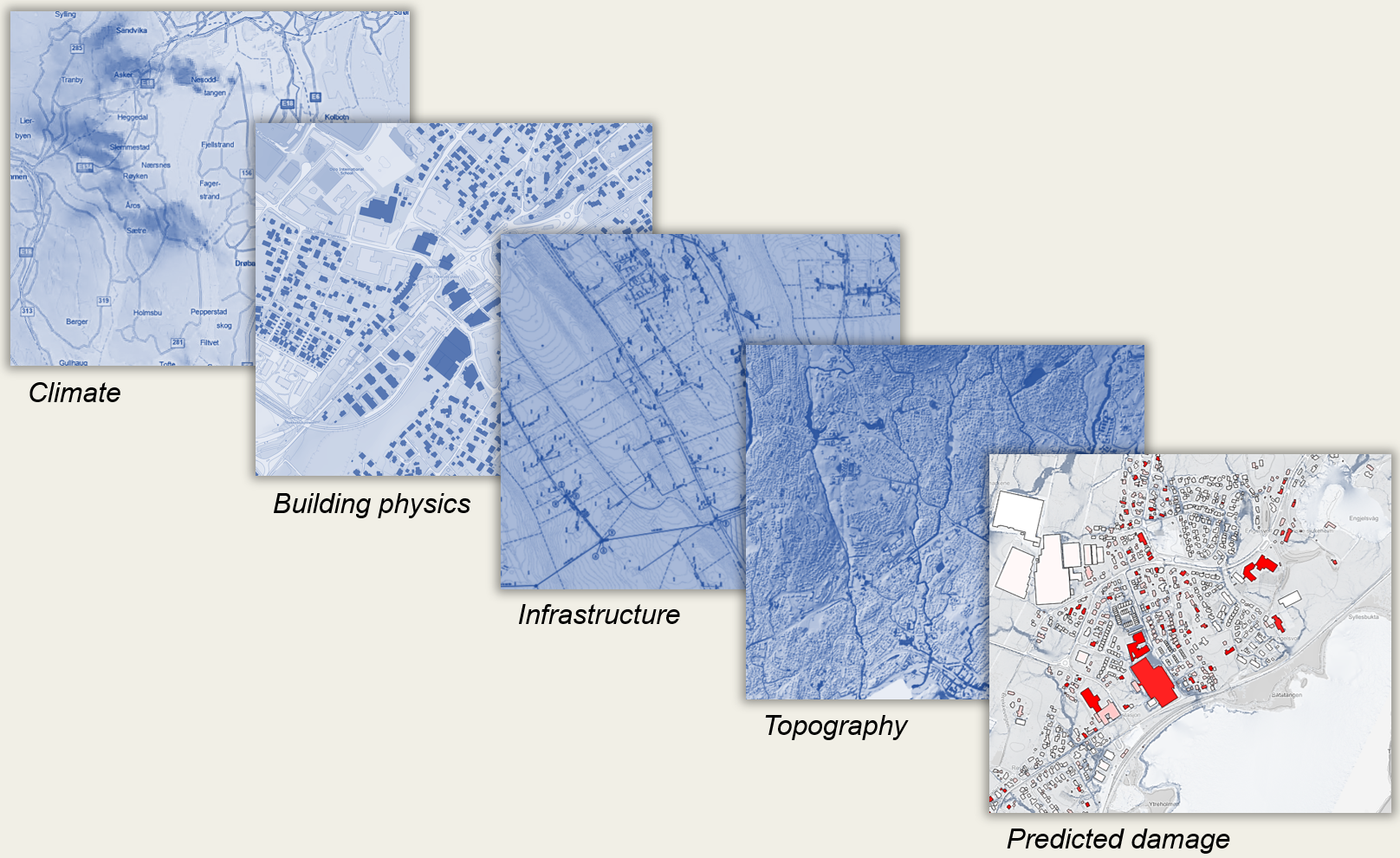 Årsakene til skader er komplekse. Overvann er bare en av mange faktorer. Våre risikoanalyser kombinerer informasjon om bygninger, topografi, infrastruktur, lokalklima og andre faktorer som påvirker risiko. Risikomodellen er testet mot store mengder skadedata. Studieområder kan lagres for å teste tiltak og konsekvenser nedstrøms med dynamiske beregninger.